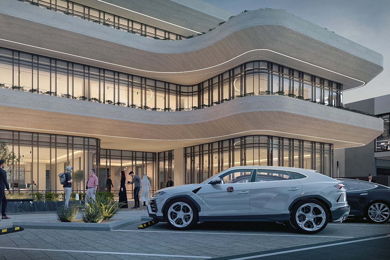 The headquarters of Aleen Real Estate, located in the vibrant Al Malqa District of Riyadh, showcases a contemporary architectural design defined by elegantly curved volumes that form dynamic and fluid façades. Each level features a distinctive curvature that enhances the building’s visual identity, adding a sophisticated aesthetic that reflects the project’s refined design language.