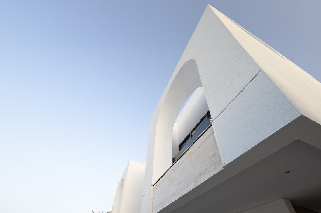The materials were carefully chosen to create a bold visual contrast between natural stone, white stucco, and black-coated steel, giving the development a contemporary identity that balances both privacy and transparency.
